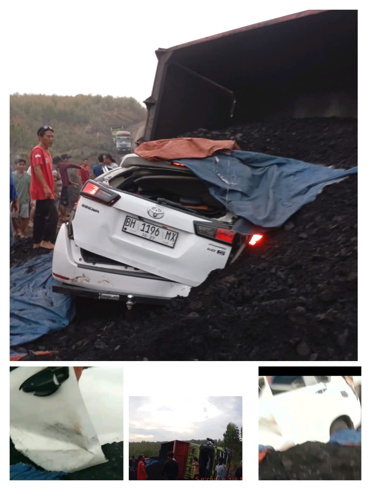 Sebuah dump truk pengangkut batubara milik PT PII dengan nomor polisi BG 8654 NX, terguling saat menanjak di jalan licin dan langsung menimpa mobil Kijang Innova yang sedang berhenti di pinggir jalan.
